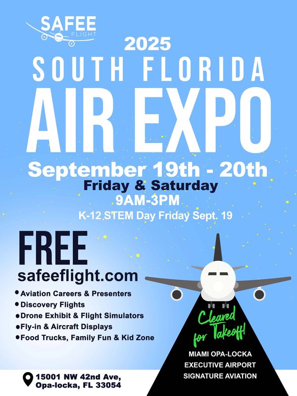 The Air Expo is a FREE family fun day at the Airport on Saturday, Sept 20th from 9am - 3pm. The South Florida Air Expo showcases all of the businesses and exciting opportunities flying into and out of our area everyday. Bring your friends, family, and colleagues to see the planes, simulators, and displays. Briefings are conducted by pilots, aviation enthusiasts, air traffic controllers, flight schools, technicians and other members of the aviation industry.